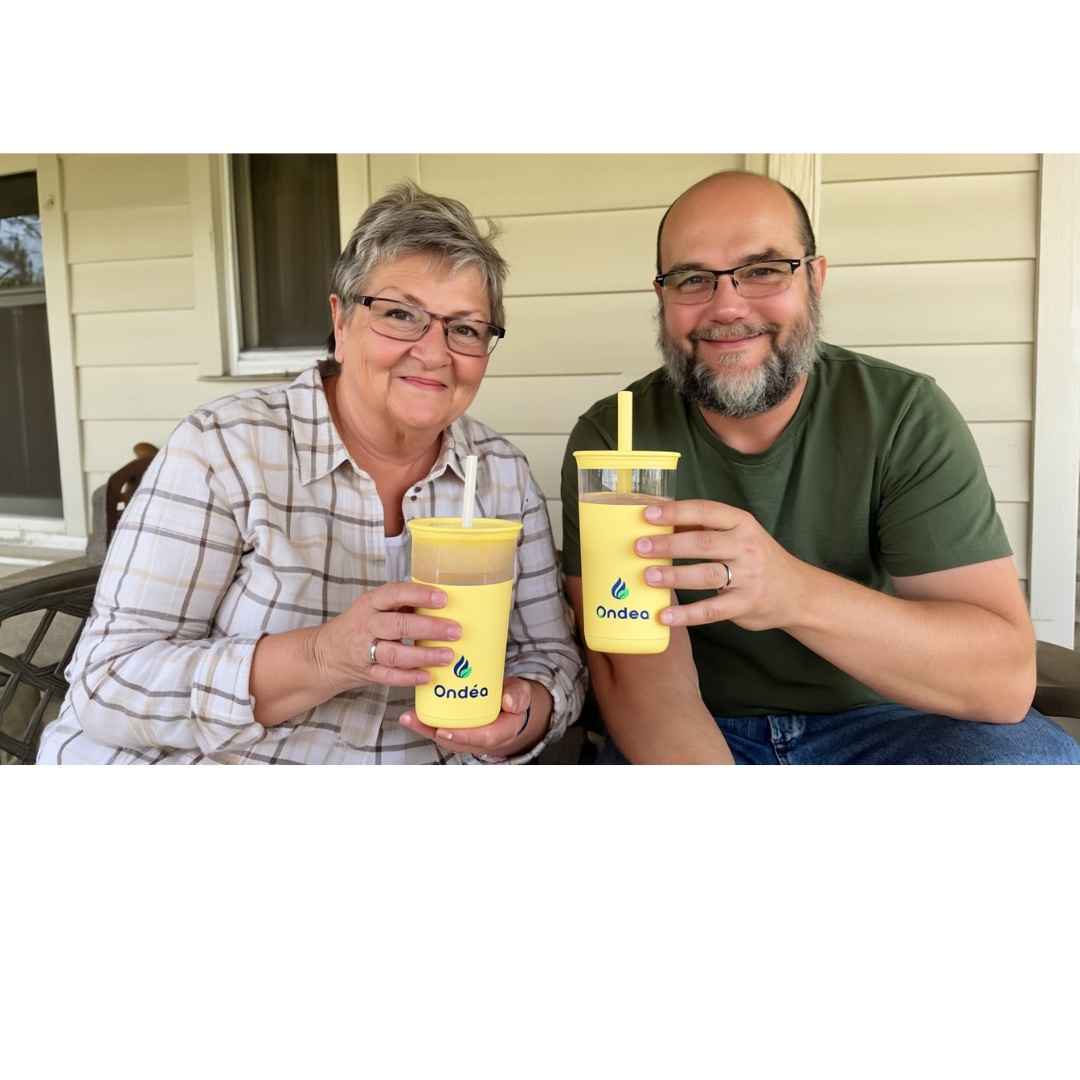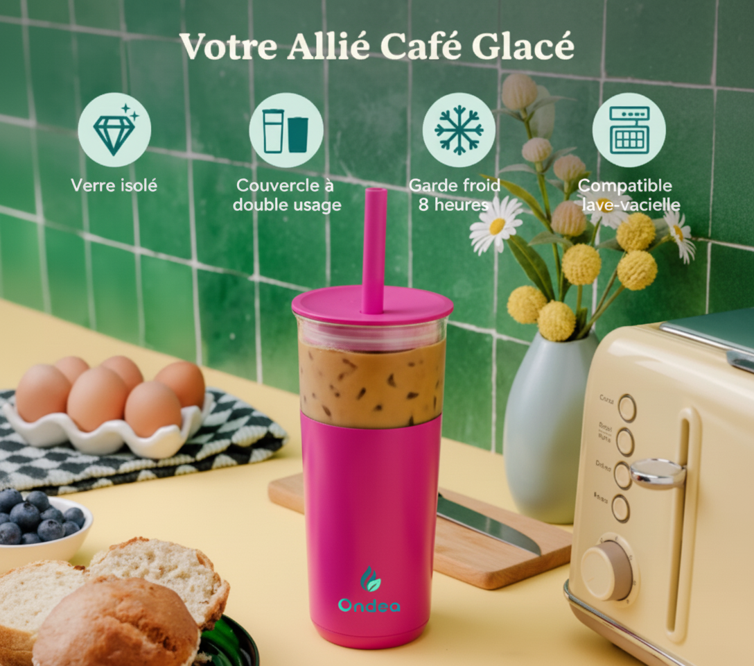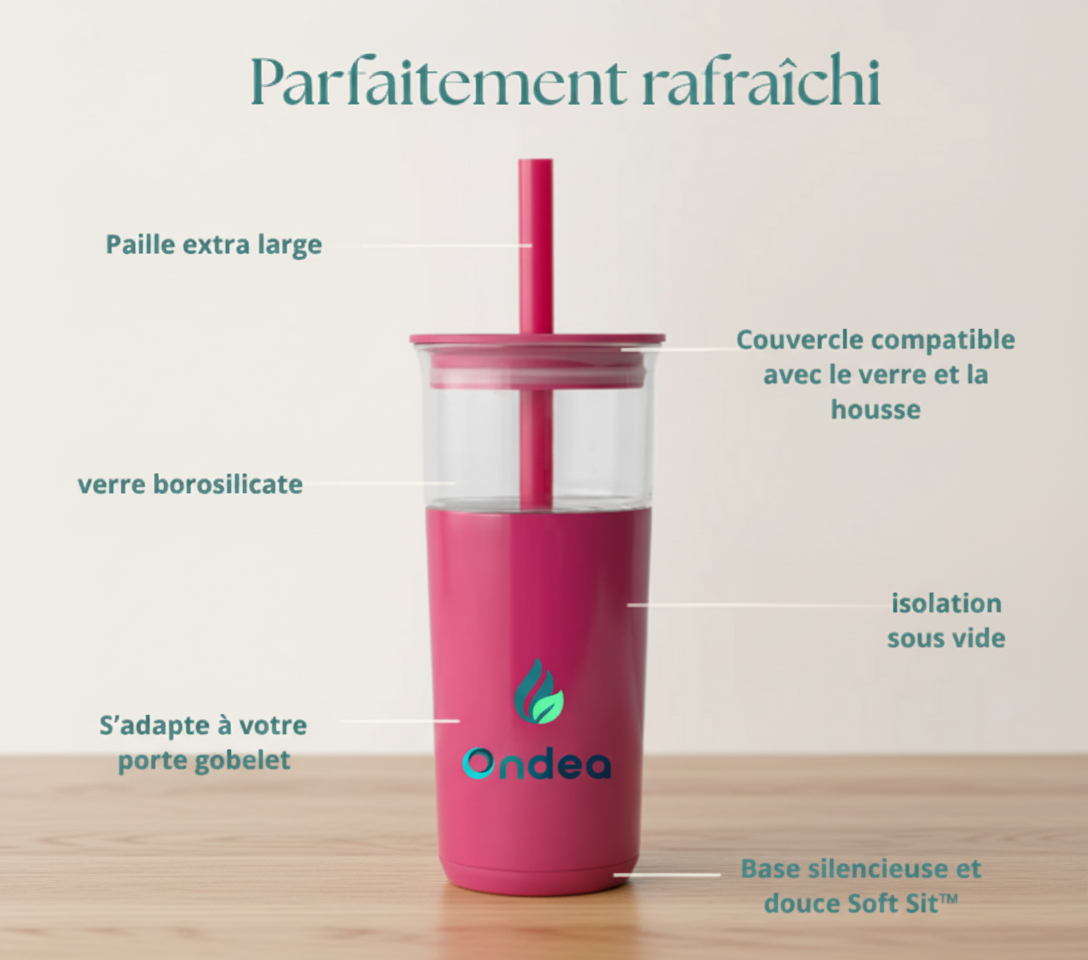 Le gobelet Ondéa, testé par des experts en sécurité alimentaire et des ingénieurs en thermodynamique, allie isolation sous vide, acier inoxydable 18/8 recyclable et verre thermo-choc pour garantir fraîcheur, confort et durabilité. 90 % des utilisateurs constatent un réel bénéfice au quotidien.